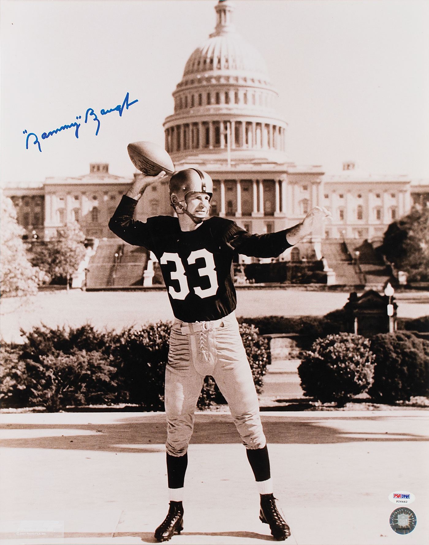 Glossy 16 x 20 full-length photo of the Washington Redskins quarterback poised to make a throw in front of the U.S. Capitol, signed in blue felt tip, "'Sammy' Baugh." In fine condition, with NFL and PSA/DNA labels affixed to lower right corner (certificates not present).