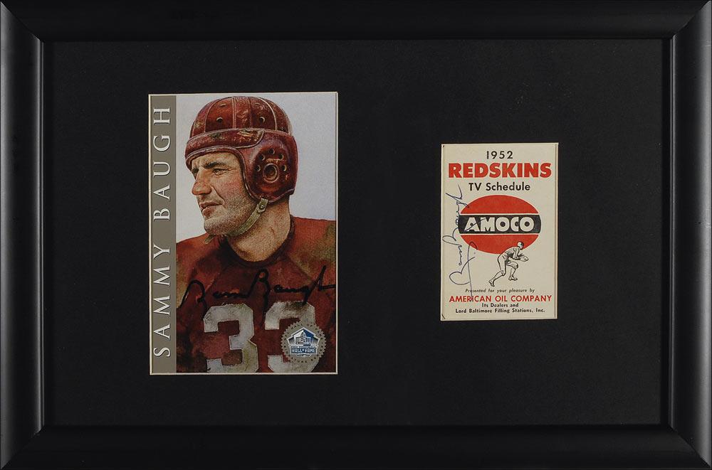 Color 4 x 6 Hall of Fame portrait of Baugh, signed in black felt tip; and a 1952 Redskins television schedule, signed vertically in blue ballpoint. Both are matted and framed together to an overall size of 15 x 10. In fine condition. Pre-certified Steve Grad/PSA/DNA and RRAuction COA.