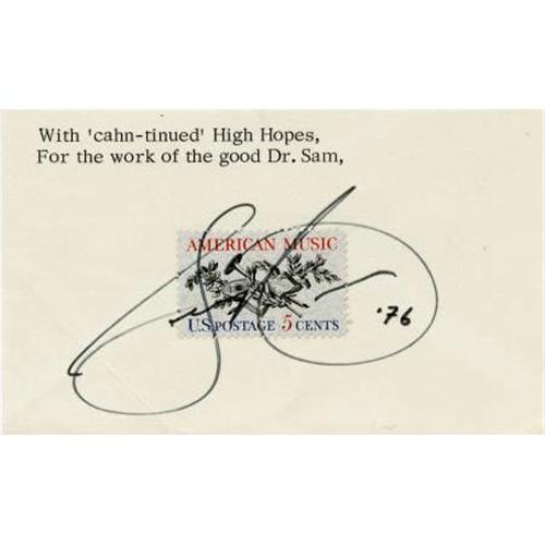 <B>Sammy Cahn Autograph.</B></I> A 5" x 3" card, with a five-cent stamp affixed, signed by the Academy Award-winning songwriter in black ink. Cahn's autograph extends across the face of the stamp and is large and clean, and dated by Cahn '76. A typed inscription from Cahn reads: "With 'cahn-tinued' High Hopes, For the work of the good Dr. Sam,". In Very Fine condition with a minor fold on lower left corner, slightly affecting signature.<BR><BR><b>Shipping:</b> Flat Material, Small (<a target="_blank" href="http://www.heritageauctions.com/common/shipping.php">view shipping information</a>)