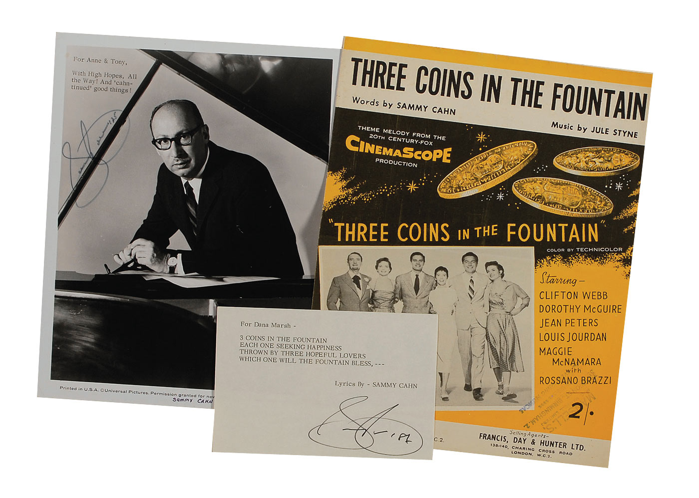 Two items: glossy 8 x 10 photo of Cahn at the piano, signed in felt tip under the typed inscription, “For Anne & Tony, With High Hopes, All the Way! And ‘cahn-tinued’ good things!”; and typed lyrics to the Academy Award-winning song ‘Three Coins in the Fountain’ on a 6 x 4 off-white card, inscribed in type to Dana Marsh and signed at the conclusion in black felt tip. In fine condition, with surface creasing and impressions to the photo. Accompanied by the original sheet music to ‘Three Coins in the Fountain.’