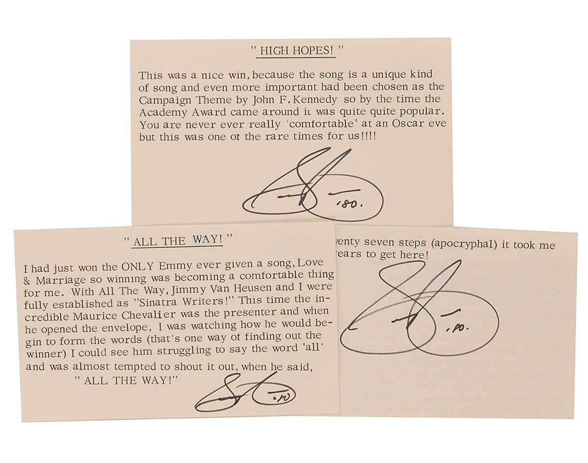 Three typed notations, all signed “Sammy Cahn 80,” on individual off-white 5 x 3 cards. Notes have to do with three of Cahn’s well-known and award-winning compositions ‘High Hopes,’ ‘All the Way,’ and ‘Three Coins in the Fountain.’ For ‘Three Coins in the