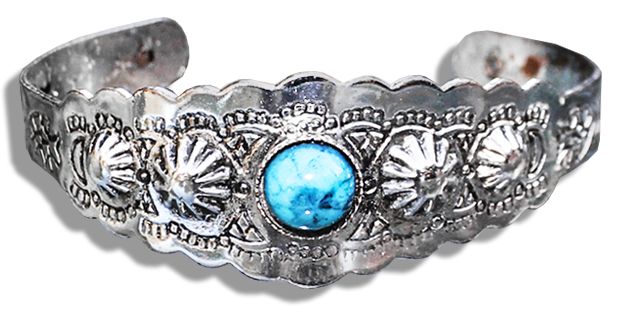 Sammy Davis, Jr. personally owned cuff bracelet. Open-ended bracelet is made of metal with a shiny silver coating. Features a turquoise color faux stone in a half-sphere shape at center. Bracelet measures 2.5'' x 2''. Some chipping to finish and a black felt tip notation inside, else near fine. Originally lot 2562 of the Butterfield & Butterfield auction of the estate of Sammy Davis, Jr., held 22 September 1991.