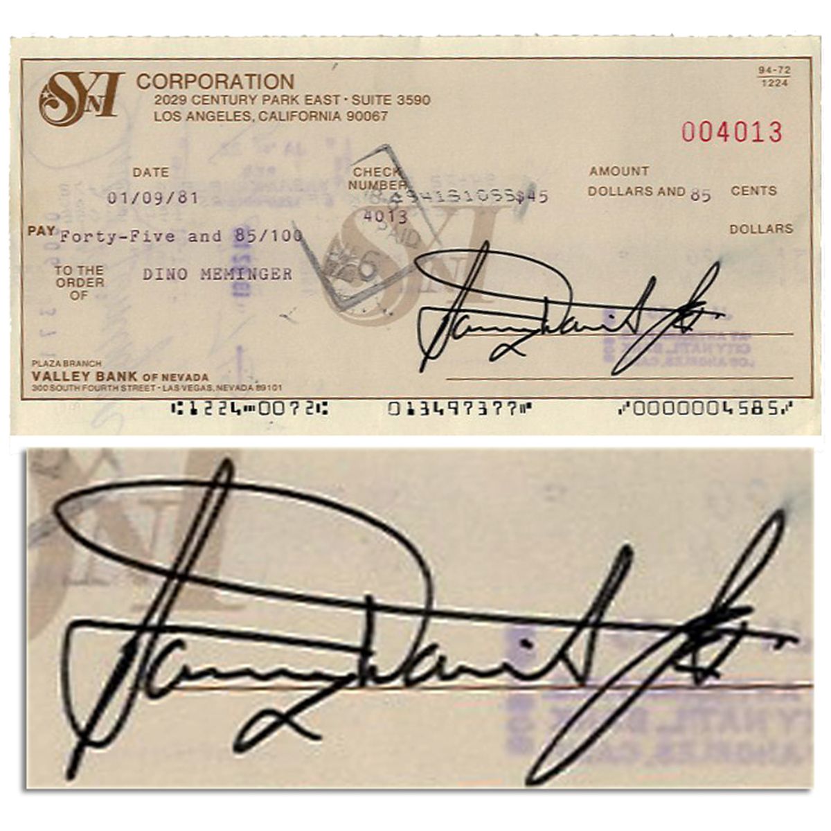 Sammy Davis, Jr. signed check dated 9 January 1981. Check in the amount of $45.85 issued by Davis' SYNI Corporation is drawn on the Valley Bank of Nevada in Las Vegas. 7'' x 3.5'' check is signed boldly in black ink. Minor smudge to signature, else near fine.