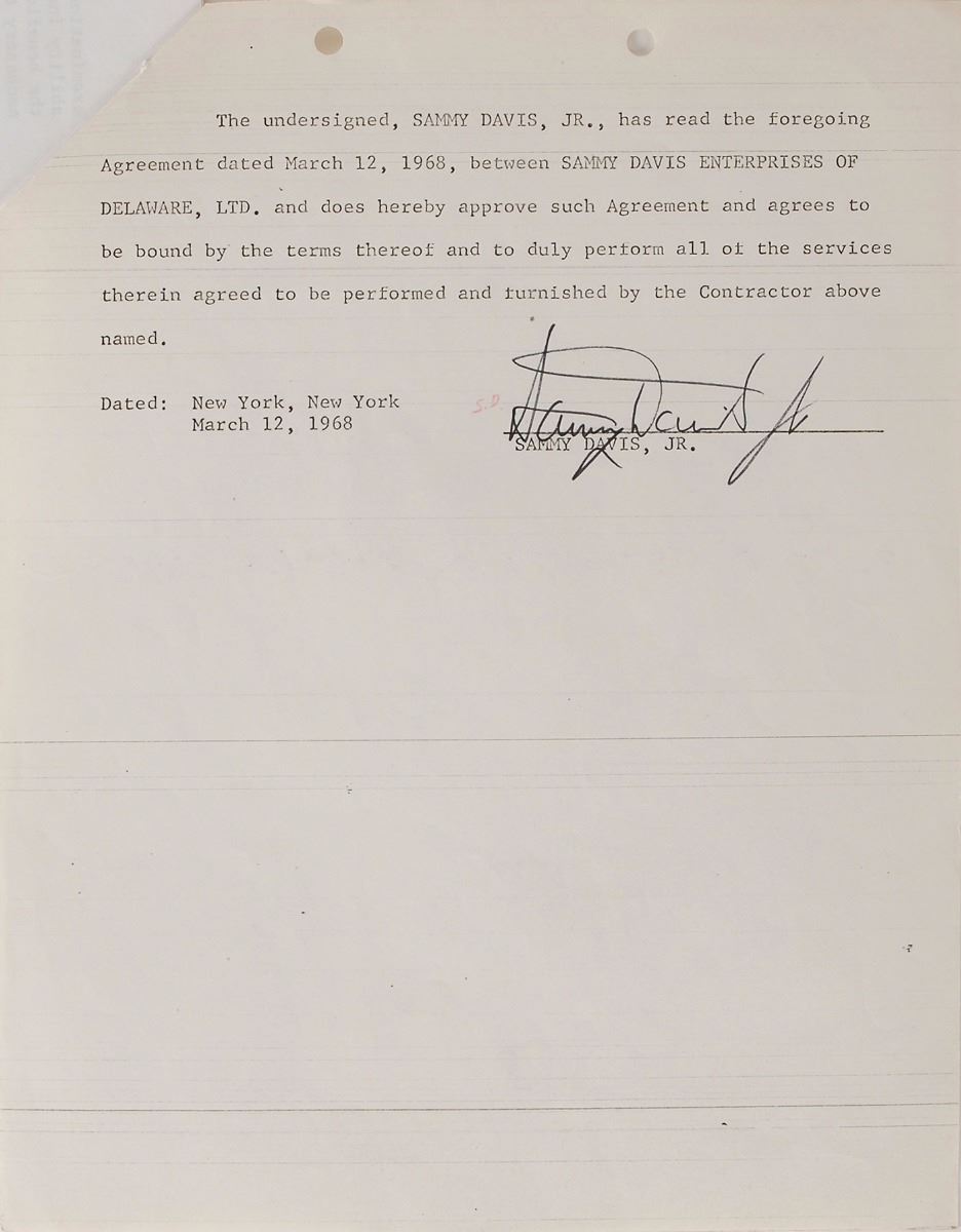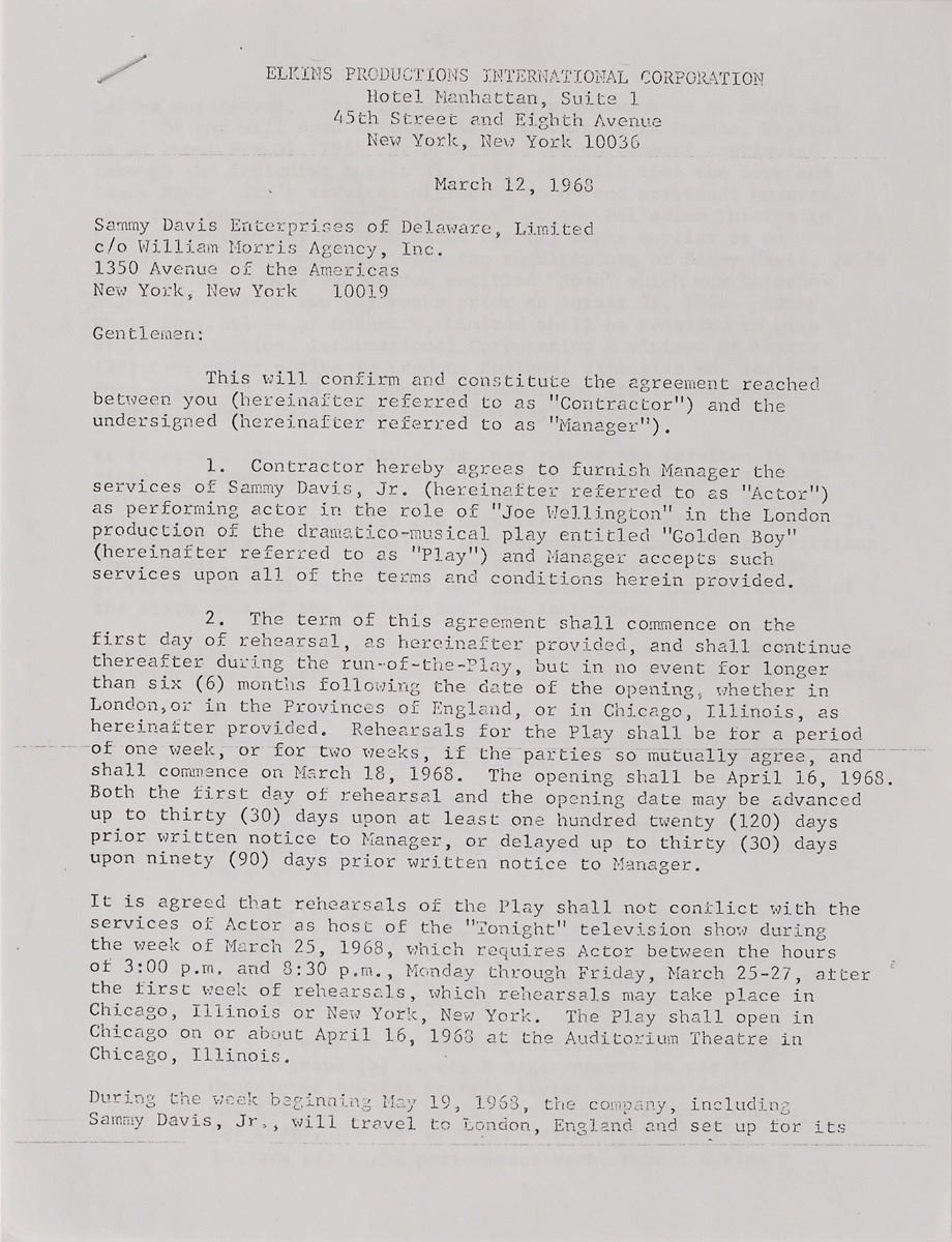 DS, eight pages, 8.5 x 11, March 12, 1968. Agreement between Elkins Productions International Corporation and Davis in which he agrees to furnish services “as performing actor in the role of ‘Joe Wellington’ in the London production of the dramatico-musical play entitled ‘Golden Boy.’” Signed at the conclusion in black felt tip by Davis. In fine condition.