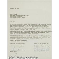 <B>Sammy Davis, Jr. Signed, Matted Ensemble.</B></I> This one-page document, dated January 28, 1969, contracts Sammy Davis Jr., to do four performances at the Melodyland Theater on February 22 and 23, for a fee of $40,000. Signed at the bottom in green ink, and double suede-matted with a signed color flyer for Harrah's in Lake Tahoe. Overall size of this lot is 21x18. Some slight dings to the frame, but otherwise, very attractive. <I>Accompanied by COA from PSA/DNA. </B></I> <BR><BR><B>Important notice:</B> Heritage usually auctions material at the rate of 200-250 lots per hour. On some occasions eBay Live bid software or the Internet may not be able to keep up with the pace of the auction. We recommend placing a realistic absentee bid now as insurance to avoid disappointment. Occasionally the auctioneer may eliminate or reject an eBay Live bid, and the auctioneer may also reopen a lot after the close of the eBay live bidding (usually because we missed an audience bid), and may reject your bid even if it shows you as the winning bidder. By bidding via eBay Live, you agree that Heritage may award the lot to another bidder at its sole discretion under the circumstances described above or any other reasonable circumstances. Since eBay bids are not shown to us until we open the lot on the floor, we treat those bids just like floor bids. In most cases the floor responds before the eBay bid is presented to us, due to Internet lag time, so for consistency we have made it a policy that floor bids are always considered first over tie eBay live bids. Also please note that all Heritage lots purchased through eBay Live carry a 24.5% Buyer's Premium. Please make sure you read the Terms and Conditions before you bid.