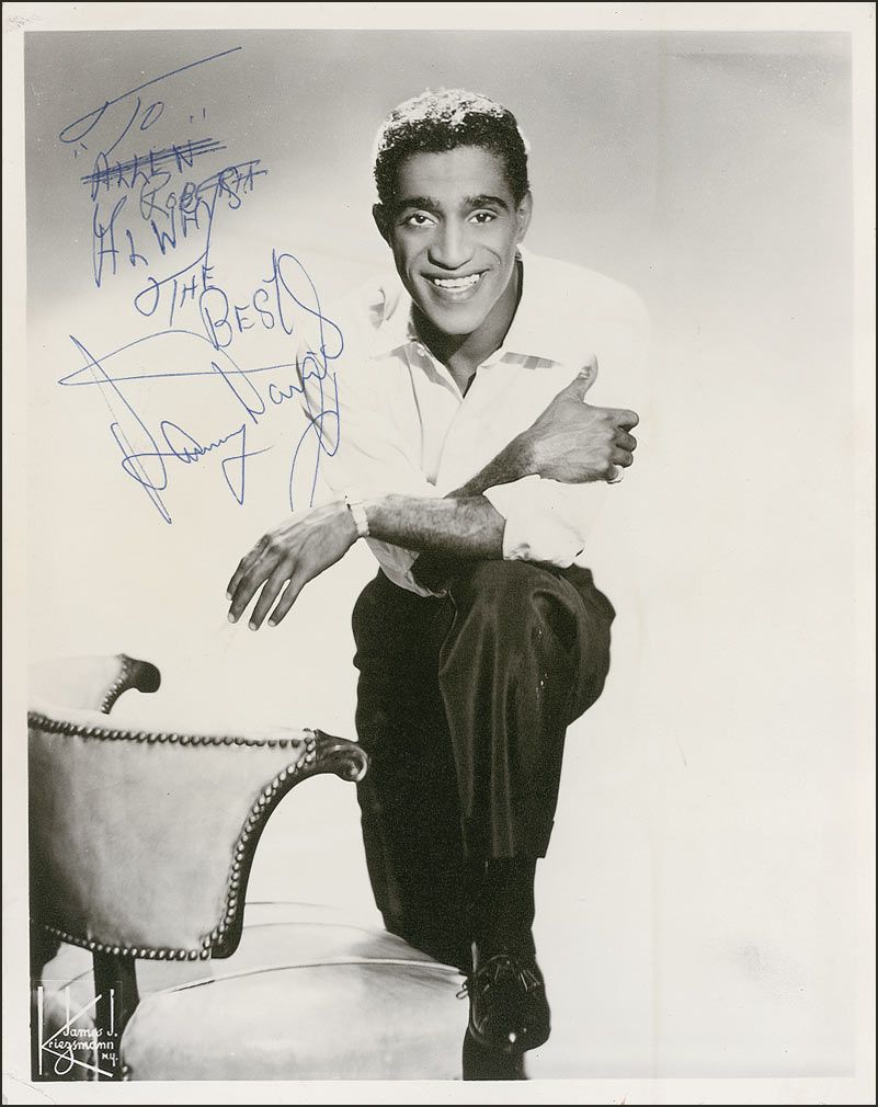 Vintage matte-finish 8 x 10 photo, signed and inscribed in blue ballpoint “To Roberta, Always the best, Sammy Davis Jr.,” with Davis crossing out an accidental inscription to “Allen.” In very good condition, with rippling to edges, crossed out inscription, and a few corner tip creases.