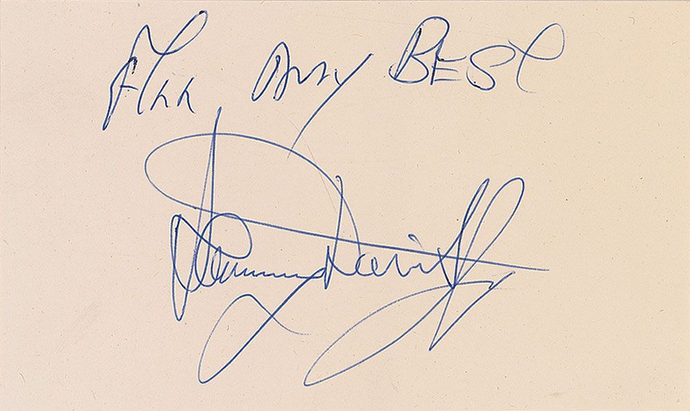 Ballpoint signature, “All My Best, Sammy Davis, Jr.,” on an off-white 5 x 3 card. In fine condition. Accompanied by a certificate of authenticity from JSA.