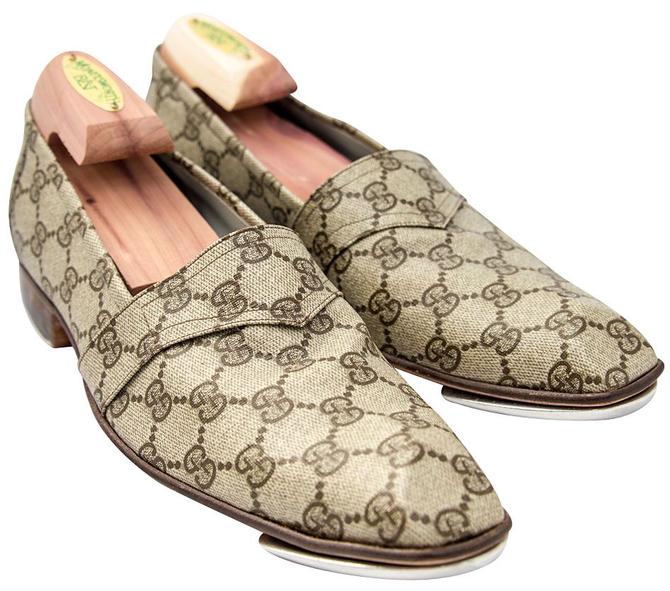 Davis’s personally-owned and worn Gucci tap shoes. Gucci loafers are stamped on the bottom and fitted with “Super S” taps on the toes, and “Super H10,” taps on the heels. The shoes were most likely used for practice or just for laughs. In fine condition, with expected wear and scuffing to soles from use. Davis was an extremely talented tap dancer for most of his life, beginning at the age of seven when he made his movie debut in the 1933 comedy short Rufus Jones for President.