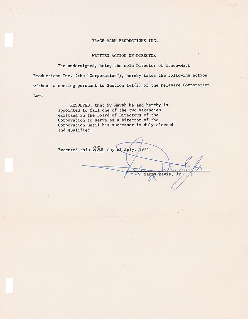 DS, one page, 8.5 x 11, July 25, 1974. Trace-Mark Productions document appointing Sy Marsh to “serve as a Director of the Corporation until his successor is duly elected and qualified.” Signed at the conclusion in blue ballpoint by Davis. In fine condition.