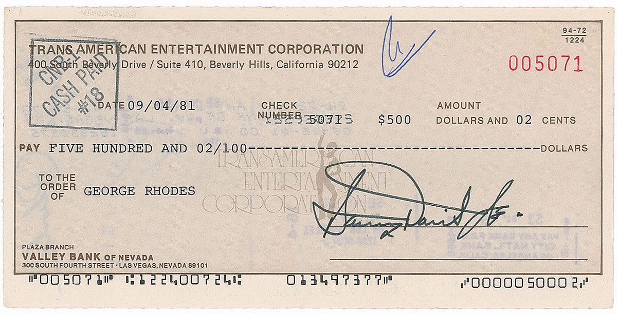 Trans American Entertainment Corporation business check, 7 x 3.5, filled out in type and signed by Davis, payable to George Rhodes for $500, September 4, 1981. In fine condition, with expected bank stamps and notations.