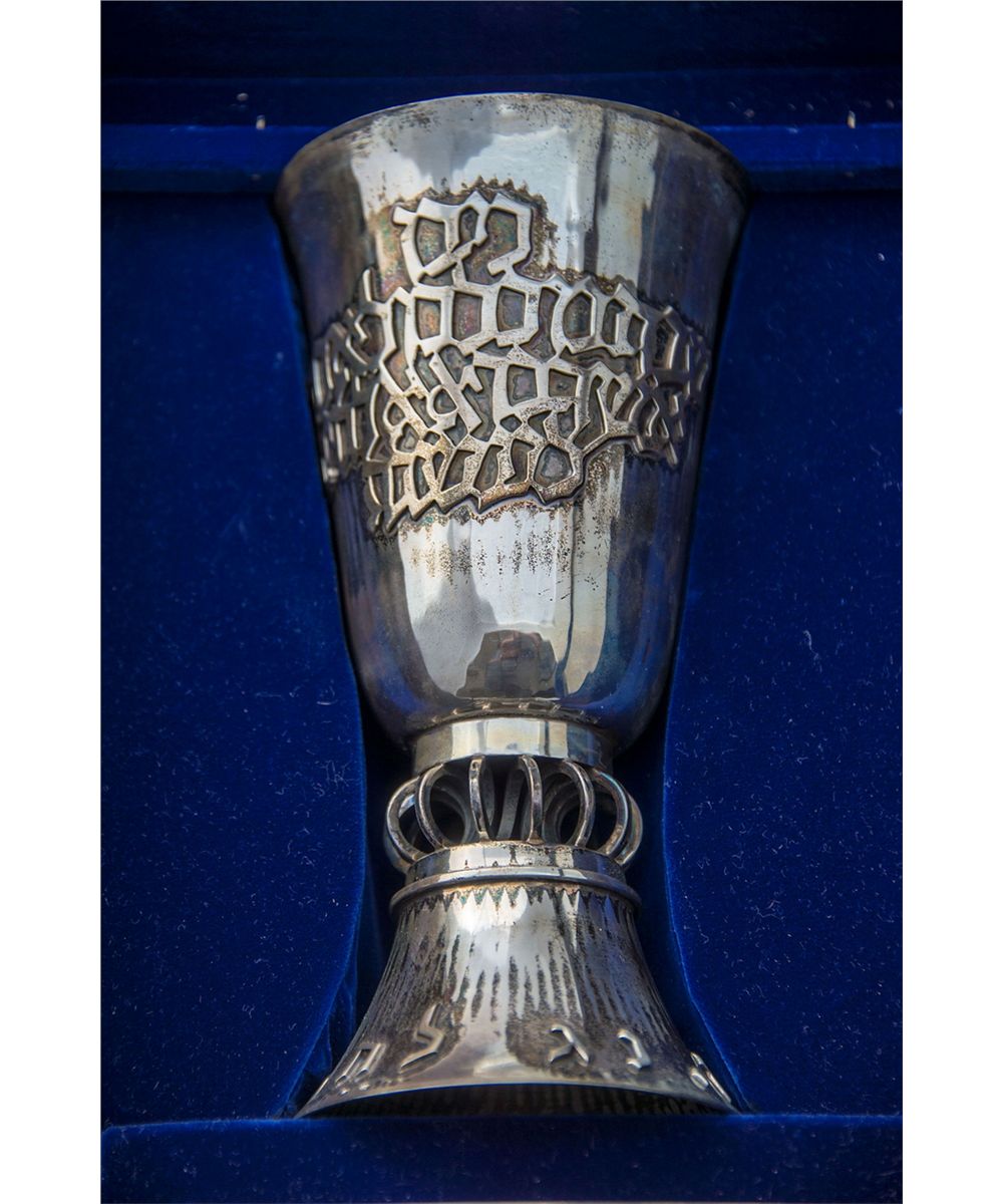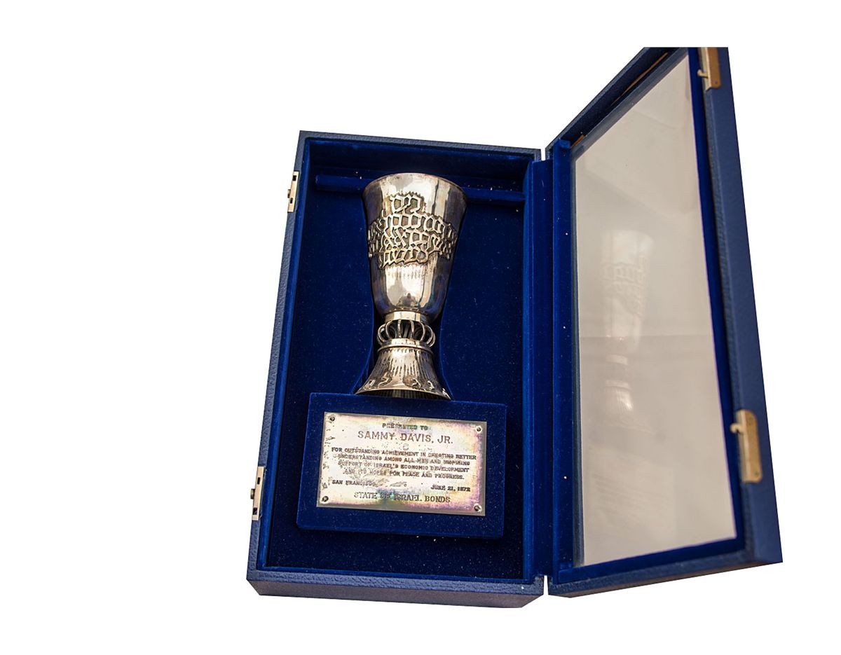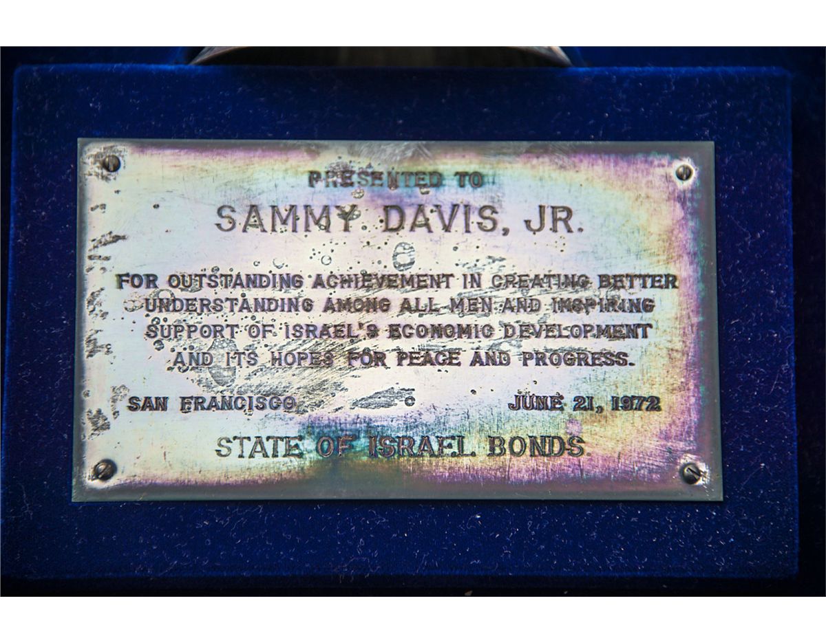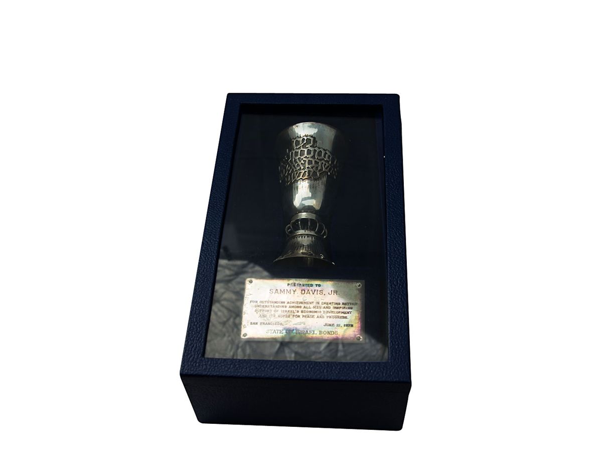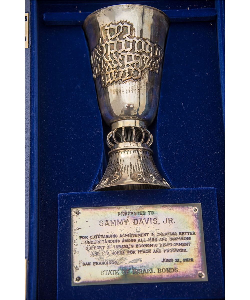 Silver cup presented to Davis on behalf of the State of Israel Bonds. Engraved silver cup measures 7.5? high, with relief Hebrew lettering around the bottom and a raised relief design on one side of the cup. Cup is housed in its original presentation box, 8.25 x 14.75 x 5, with an engraved silver plaque at the bottom which reads, “Presented to Sammy Davis, Jr.for outstanding achievement in creating better understanding among all men and inspiring support of Israel’s economic development and its hopes for peace and progress. San Francisco, June 21, 1972, State of Israel Bonds.” In very good to fine condition, with moderate tarnishing to cup and presentation plaque. The Development Corporation for Israel (Israel Bonds) was founded in 1951 to raise money from the American public for the fledgling Israeli state, which, at the time, was struggling to build an infrastructure and economy to support its growing population. The first Israel Bonds sales drive was launched in New York by David Ben-Gurion in 1951, and would raise 52.6 million dollars by the end of 1951. The funds raised by the sale of Israel Bonds in 1951 and in subsequent years and decades were key factors in establishing a sound Israeli economy. Davis was severely injured in a car accident in 1954, in which he lost his left eye. His friend Eddie Cantor discussed the similarities of the Jewish and African American cultures. Davis would formally convert to Judaism in 1961, and would become an ardent supporter of the country for the remainder of his life.