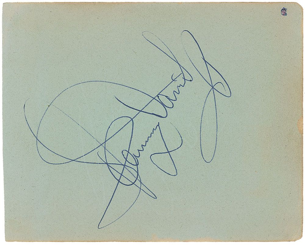 Ballpoint signature, “Sammy Davis, Jr.,” on a light green 5.5 x 4.5 album page. In fine condition, with some mild edge toning and an impression from a signature from another page in the album.