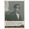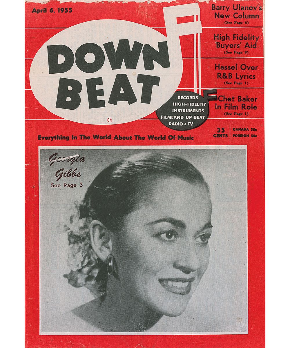 Down Beat magazine, dated April 6, 1955, 11 x 15, 19 pages. Signed inside in blue ballpoint on a full-page thank-you ad from Davis, “All my best, Sammy Davis, Jr.” Central horizontal fold, scattered creases, edge wear, and handling wear, otherwise fine condition.