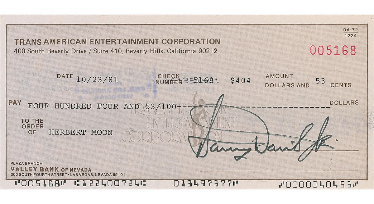 Trans American Entertainment Corporation business check, 7 x 3.25, filled out in type and signed by Davis, payable to Herbert Moon for $404.53, October 23, 1981. In fine condition, with some light show-through from stamps on reverse.