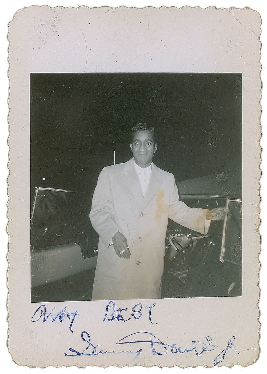 Wonderful vintage glossy 2.5 x 3.5 candid deckle-edge photo of Davis in a long coat with a cigarette in his hand, signed in the lower border in blue ink, “My best, Sammy Davis, Jr.” Reverse bears a collector’s date notation of October 17, 1954. In fine condition, with some light areas of discoloration.