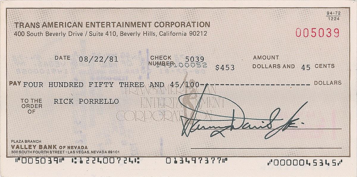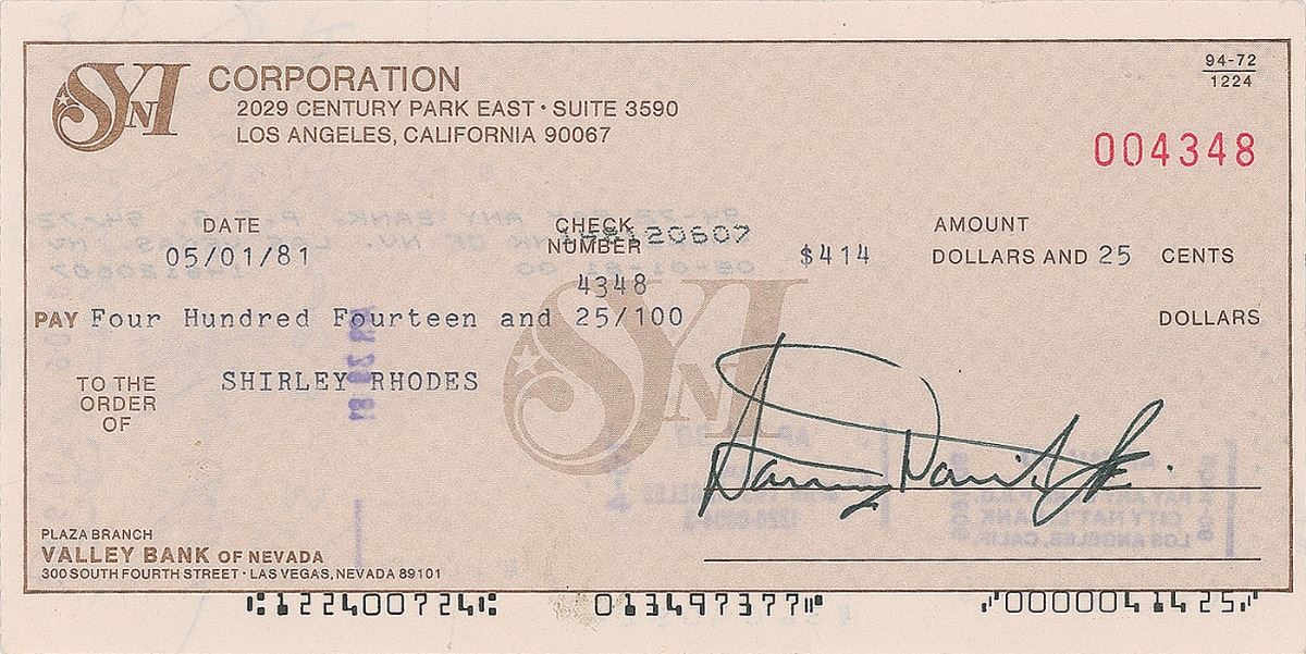 Two business checks, both 7 x 3.5, filled out in type and signed by Davis, Jr., dated May and August 1981. In overall fine condition.