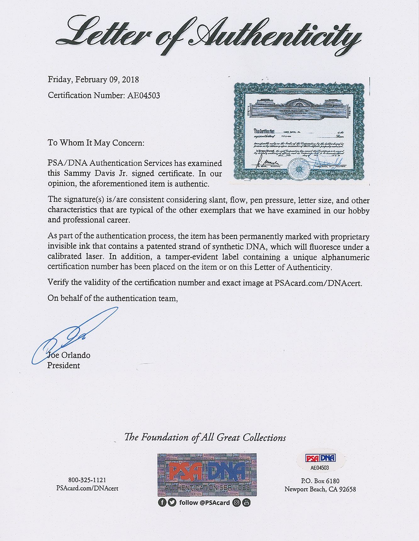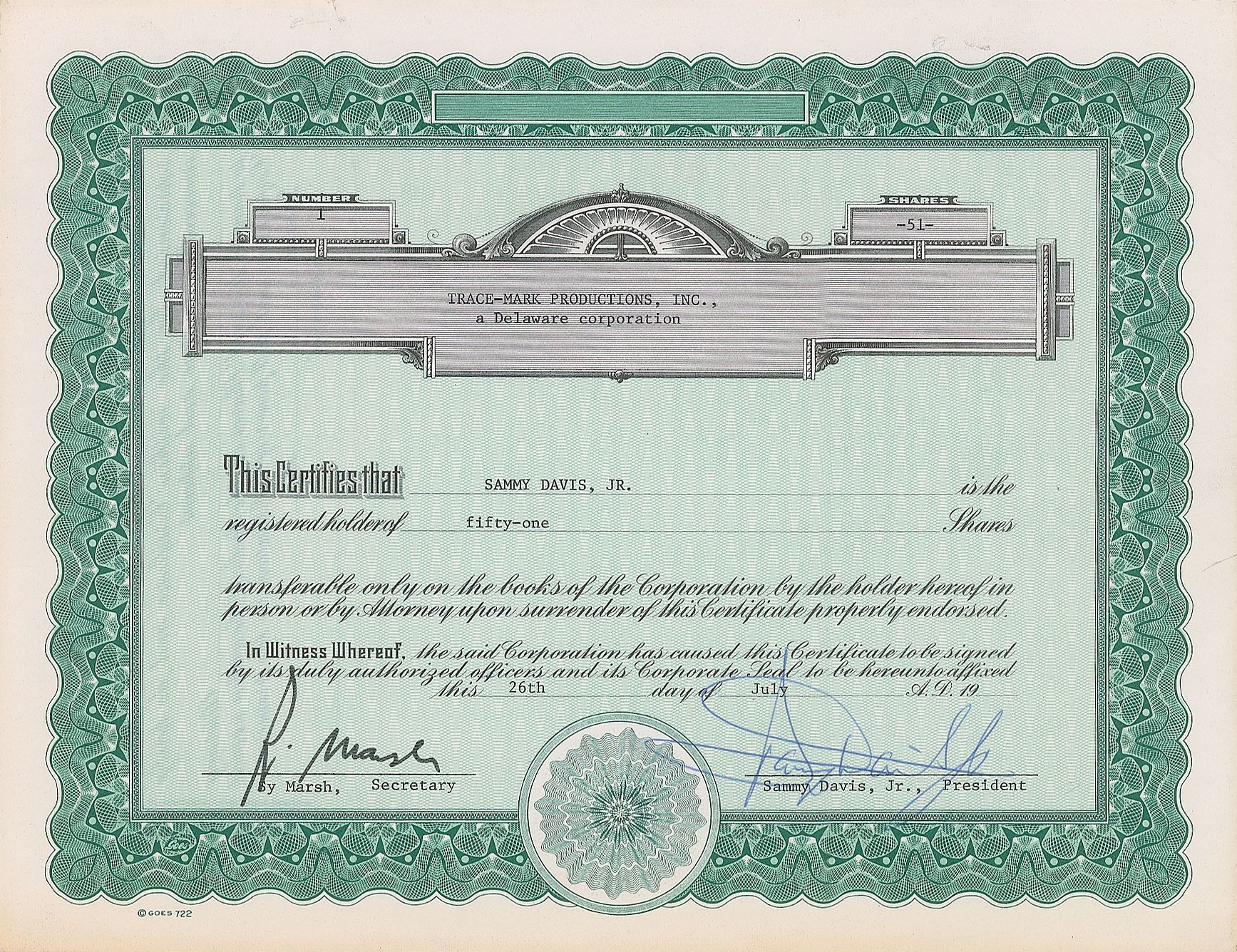 DS, one page, 11 x 8.5, July 26, [1974]. Certificate for 51 shares of stock in Trace–Mark Productions, Inc., issued to Sammy Davis Jr., who signs at the conclusion in blue ballpoint as the company president. In fine condition, with staple holes to top edge. Accompanied by a full letter of authenticity from PSA/DNA and an unsigned 22-page agreement between Davis and Sammy Davis Enterprises, relating to seven-and-a-half shares of stock, dated July 25, 1974.