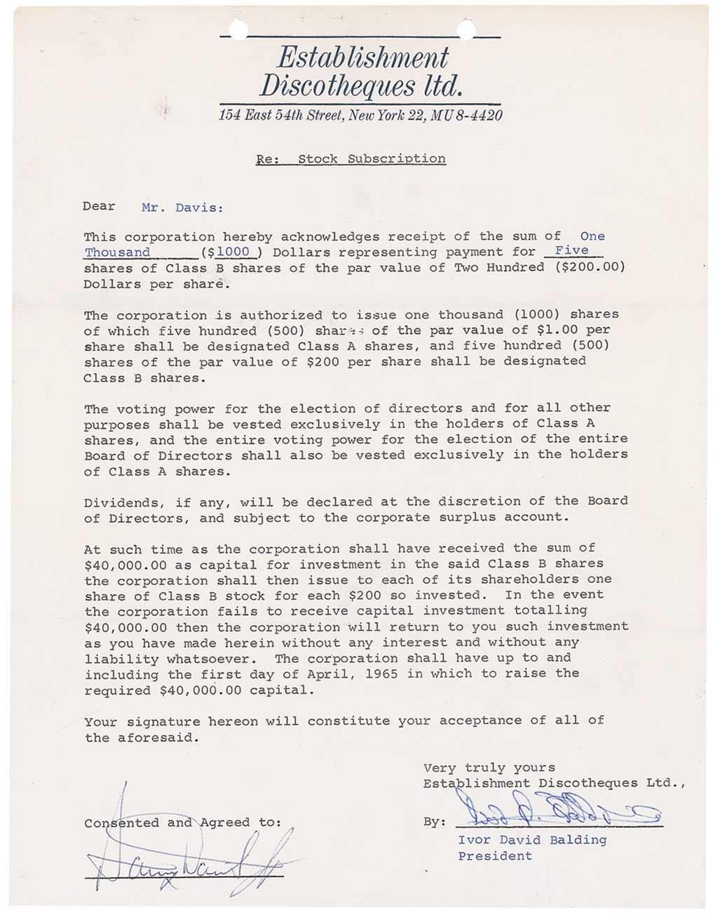DS, one page, 8.5 x 11, no date. Acknowledgment from Establishment Discotheques Ltd. having received $1000 as payment for five shares of Class B stock in the corporation. Signed at the bottom in ballpoint by Davis, Jr. Intersecting folds, punch and staple holes to top edge, and a bit of light toning, otherwise fine condition.