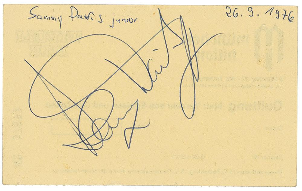 Ballpoint signature, “Sammy Davis, Jr.,” on the reverse of a light yellow 5.25 x 3.25 München Hilton Tivoli Bar receipt, notated at the top in a collector’s hand, “26.9.1976.” In fine condition, with a few light creases and wrinkles.