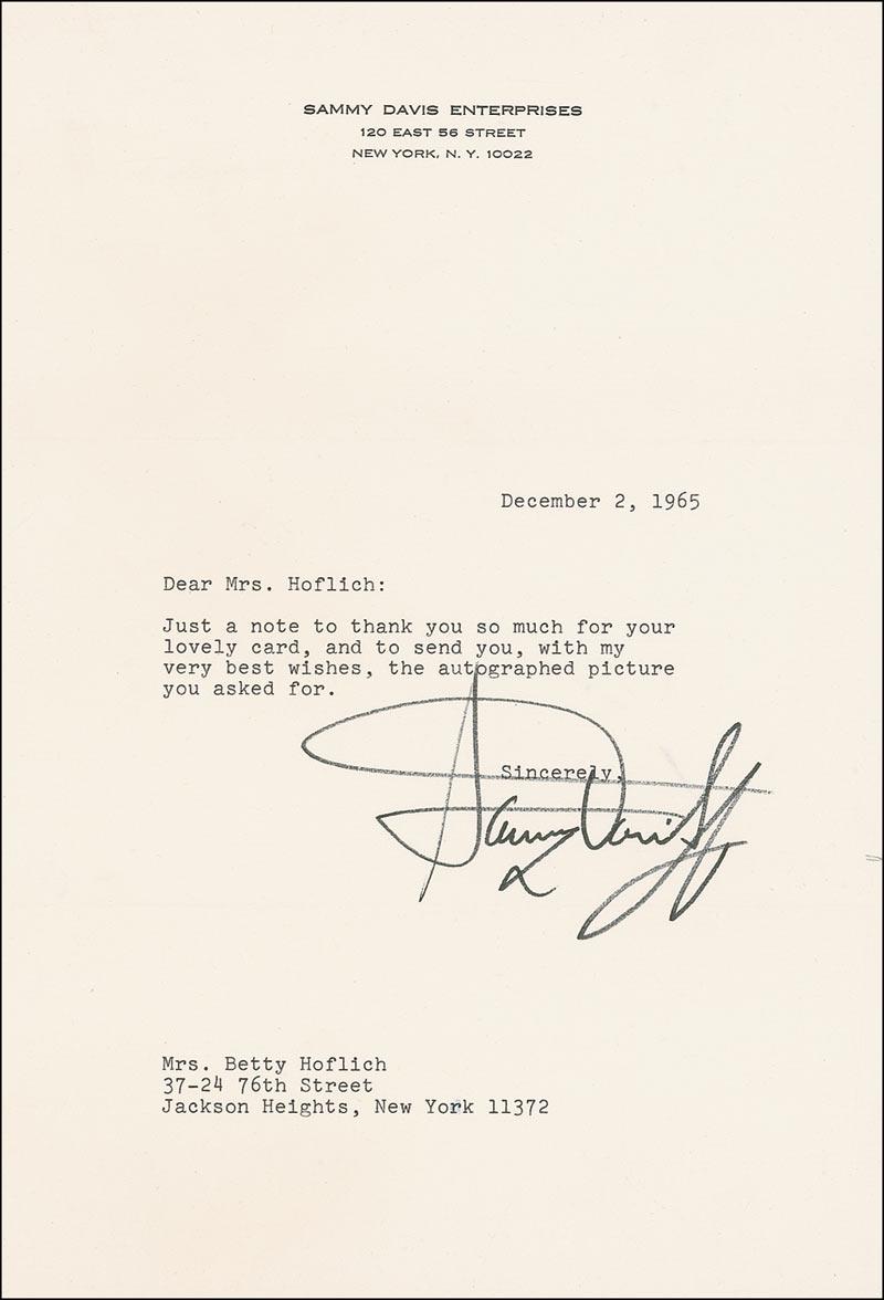 TLS, one page, 7.25 x 10.5, Sammy Davis Enterprises letterhead, December 2, 1965. Short letter to a collector. In full: “Just a note to thank you so much for your lovely card, and to send you, with my very best wishes, the autographed picture you asked for.” In fine condition.