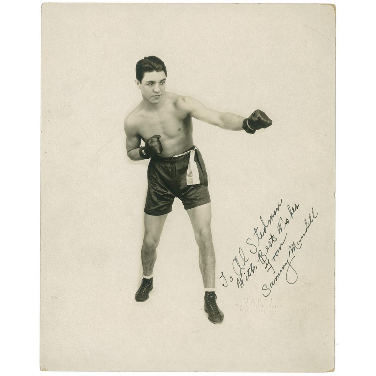 American boxer (1904–1967), known as the ‘Rockford Sheik,’ who was world lightweight champion from 1926 to 1930 and who was inducted into the Boxing Hall of Fame in 1998. Vintage matte-finish 8 x 10 Marsh Studios portrait, signed and inscribed in fountain pen, “To Al Stedman, With Best Wishes from Sammy Mandell.” Scattered creasing touching the start of his sentiment, a bit of loss to the emulsion at the top right corner, light soiling, and silvering to the darker areas, otherwise fine condition.