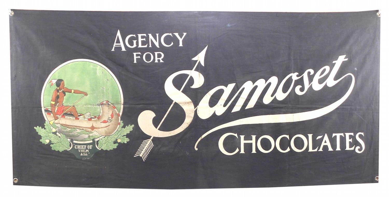 Agency for Samoset Chocolates Canvas Banner. Entitled, "Chief of them all". Metal grommets at all four corners. A few stains in the center otherwise excellent condition. 60 X 28 inches.
