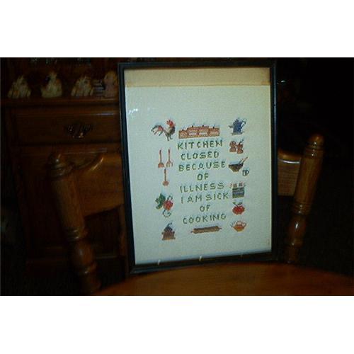 Featuring a framed sampler. The frame is black with glass. It measures 17 inches tall by 12 3/4 inches wide. The sampler is made of linen and states: KITCHEN CLOSED BECAUSE OF ILLNESS. I AM SICK OF COOKING. Displays a Rooster, coffee pot, utensils, coffee grinder, rolling pin, tea pot, apple, toaster, Bowl with spoons, measuring cup, salt & pepper shakers and a canister all crossed stiched. Colors include red, brown, black, green, orange, and blue. The frame is larger than the sampler. The sampler measures 14 inches by 12 1/4 inches wide. Excellent condition. The back of the frame still has the old rope/cord type hanger. Beautiful, vintage sampler.