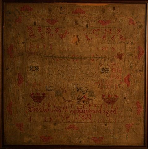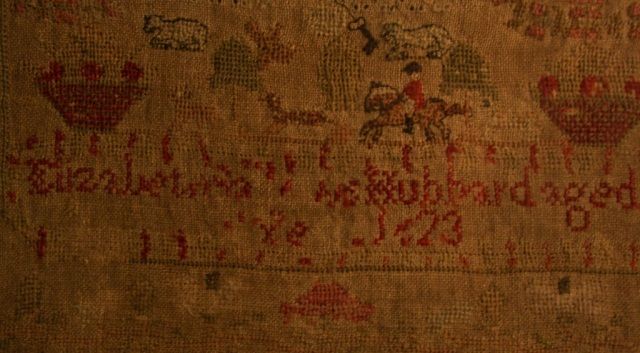 Sampler, Early 1800"s, Sampler, Early 1800"s, Worked by Elizabeth Hubbard, in 1823, With Horse and rider, Small hole top center,