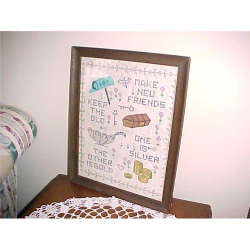 <table width="100%" border="0" cellspacing="0" cellpadding="4"><tr><td><em> </em></td></tr><tr> <td width="100%"> Sampler, Framed 12 X 15; (c) early 1900's on linen base saying; "Make new friends, Keep the Old, One is