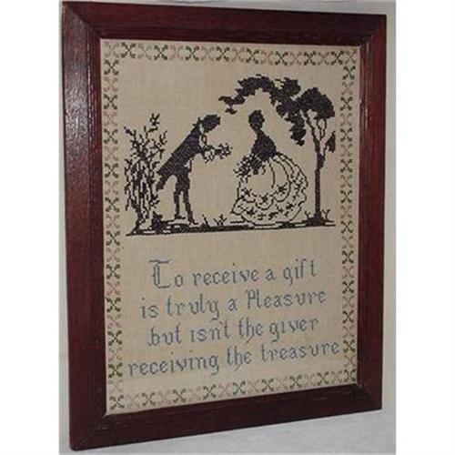 A cross stitch sampler in an oak frame, 17" X 21". "To receive a gift is truly a pleasure but isn't the giver receiving the treasure", is the verse under the silhouette of a 19th century courting couple in black stitching. The whole thing framed with green and beige X's on linen. A beautiful mid 20th century needlework for the collector.