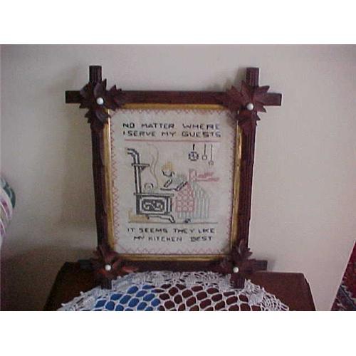 Sampler in Early Cross Frame; Mother of Pearl Buttons; Gold inter frame; 13" X 15"; "No maatter where I serve my guests--It seems they like my kitchen best."