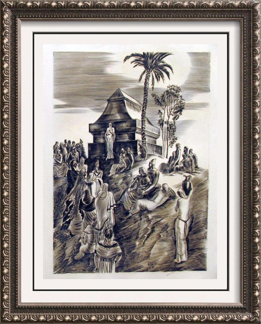 Albert Decaris | Title of Art: c. 1939 From the Samson Agonistes Suite | Medium: Engraving on Paper | Edition #: 5/55 | Unframed Size: 15 x 11 inches | Offered Unframed | Value: $ 950 | Art For Sale presents limited edition engravings by Albert Decaris from Samson Agonistes by poet John Milton. Drawing on the story of Samson from the Old Testament, Judges 13–16, each engraving is a dramatization of the story starting at Judges 16:23. The drama starts as Samson has been captured by the Philistines, had his hair, the container of his strength, cut off and his eyes cut out. Samson is "Blind among enemies, O worse than chains" (line 66).Samson undergoes despair when he loses God’s favor in the form of his strength. Milton’s dramatic poem, however, begins the story of Samson after his downfall—after he has yielded his God-entrusted secret to Dalila (Delilah), suffered blindness, and become a captive of the Philistines. Tormented by anguish over his captivity, Samson is depressed by the realization that he, the prospective liberator of the Israelites, is now a prisoner, blind and powerless in the hands of his enemies. The focus of Milton’s dramatic poem is ultimately on Samson’s regenerative process, an inner struggle beset by torment, by the anxiety that God has rejected him, and by his failure as the would-be liberator of his people. Samson’s discourse manifests an upward trajectory, through atonement and toward regeneration, which culminates in the climactic action at the temple of Dagon where Samson, again chosen by God, vindicates himself. In his searching for a way to return to being true to God and to serve his will, Samson is restored and again is in God’s grace and able to serve God. | Albert Decaris (1901-1988): One of France’s foremost engravers of the twentieth century, Albert Decaris is born in Normandy in Sotteville-les-Rouen in 1901. He began his formal art studies at the age of fourteen at the Ecole Estienne. Four years later he was accepted into the Ecole des Beaux-Arts (School of Fine Arts), Paris, and studied in the studios of Carmon and Laguillermie. Within six months Decaris had won the Premier Grand Prix de Rome of engraving (1919) and became the youngest student ever to win this prestigious honor for his work ‘Eve before the sin’. Decaris thus journeyed to Rome where he worked and lived at the Villa Medici. Unfortunately he contacted malaria on a journey to Paestum and was critically ill for a period of one year. Upon his recovery Albert Decaris was ‘rewarded’ with a two year mandatory service in the French military. After this he concluded his fellowship in Rome and then returned to Paris. He first worked upon a series of engravings of Belgian subjects which he submitted to the Paris Salon. These works received the Salon’s Medaille d’Argent (Silver Medal). It was the first time in the Salon’s long history that an artist had received this major medal with his premiere presentation. During the following years Albert Decaris created a major oeuvre of original engravings and etchings, both as individual plates and as illustrations for livres d’artistes. In the first category, he began with big engravings inspired by his classic souvenirs, mythological scenes like Leda and the Swan, The Rape of Europe, Pasiphae, etc. In the latter category he illustrated such magnificent books as Shakespeare’s, Macbeth (1930), Cathlin’s, Le Sommeil d’Endymion (1934), Milton’s, Samson Agonistes (1939), Chenier’s, Eglogues (1945), Henriot’s, Mythologie des Anciens Grecs et Romains (1955), Corneille’s Theater (1955-1961), Emile Henriot, Les Trophees (1967) and Eschyle, Tragedies, under the direction of Mario Vincent (1975-1977). One of Decaris’s greatest illustrated books is Pierre de Ronsard’s, Discours des Miseres de ce Temps, which was published in Paris in 1930. Consisting of three large volumes, Decaris created forty-five engravings which were published in an edition of 359. As well, Decaris selected some of the plates to be printed separately in a limited edition of one hundred signed impressions. Such is the case with Ronsard, which probably served as the frontis-piece to the above named volume. He illustrated around 200 books, especially Ronsard, Shakespeare, La Rochefoucauld, Chateaubriand, Vigny, Montherlant, Claudel, Giono... He collaborated to the Art-Deco International Exhibition of 1937 in Paris where he realized 300 square meters of paintings and to the International Exhibition of New York in 1938 for which he did a huge painting ‘The Plague’. He did huge frescoes for the monumental stairs of the City Hall of Vesoul and for other monuments, churches and chapels. Between 1935 and 1985 Albert Decaris created more than six hundred stamps for France (174) and its territories, Monaco, Andorra, Tunisia, etc. Held in equally high esteem for his architectural, historical, landscape, portrait and figurative engravings, he became a full member of the Academie des Beaux-arts in 1943 and was nominated its President in 1960 an re-elected four times. In 1962 Decaris was named the official painter of the Marine Francaise (Navy). His style, ample, classic and marked with archaism of his engraving work can be also find in the severe disposition of his drawings and paintings.
