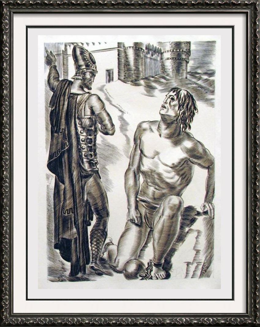 Albert Decaris | Title of Art: c. 1939 From the Samson Agonistes Suite | Medium: Engraving on Paper | Edition #: 5/55 | Unframed Size: 15 x 11 inches | Offered Unframed | Value: $ 950 | Art For Sale presents limited edition engravings by Albert Decaris from Samson Agonistes by poet John Milton. Drawing on the story of Samson from the Old Testament, Judges 13–16, each engraving is a dramatization of the story starting at Judges 16:23. The drama starts as Samson has been captured by the Philistines, had his hair, the container of his strength, cut off and his eyes cut out. Samson is "Blind among enemies, O worse than chains" (line 66).Samson undergoes despair when he loses God’s favor in the form of his strength. Milton’s dramatic poem, however, begins the story of Samson after his downfall—after he has yielded his God-entrusted secret to Dalila (Delilah), suffered blindness, and become a captive of the Philistines. Tormented by anguish over his captivity, Samson is depressed by the realization that he, the prospective liberator of the Israelites, is now a prisoner, blind and powerless in the hands of his enemies. The focus of Milton’s dramatic poem is ultimately on Samson’s regenerative process, an inner struggle beset by torment, by the anxiety that God has rejected him, and by his failure as the would-be liberator of his people. Samson’s discourse manifests an upward trajectory, through atonement and toward regeneration, which culminates in the climactic action at the temple of Dagon where Samson, again chosen by God, vindicates himself. In his searching for a way to return to being true to God and to serve his will, Samson is restored and again is in God’s grace and able to serve God. | Albert Decaris (1901-1988): One of France’s foremost engravers of the twentieth century, Albert Decaris is born in Normandy in Sotteville-les-Rouen in 1901. He began his formal art studies at the age of fourteen at the Ecole Estienne. Four years later he was accepted into the Ecole des Beaux-Arts (School of Fine Arts), Paris, and studied in the studios of Carmon and Laguillermie. Within six months Decaris had won the Premier Grand Prix de Rome of engraving (1919) and became the youngest student ever to win this prestigious honor for his work ‘Eve before the sin’. Decaris thus journeyed to Rome where he worked and lived at the Villa Medici. Unfortunately he contacted malaria on a journey to Paestum and was critically ill for a period of one year. Upon his recovery Albert Decaris was ‘rewarded’ with a two year mandatory service in the French military. After this he concluded his fellowship in Rome and then returned to Paris. He first worked upon a series of engravings of Belgian subjects which he submitted to the Paris Salon. These works received the Salon’s Medaille d’Argent (Silver Medal). It was the first time in the Salon’s long history that an artist had received this major medal with his premiere presentation. During the following years Albert Decaris created a major oeuvre of original engravings and etchings, both as individual plates and as illustrations for livres d’artistes. In the first category, he began with big engravings inspired by his classic souvenirs, mythological scenes like Leda and the Swan, The Rape of Europe, Pasiphae, etc. In the latter category he illustrated such magnificent books as Shakespeare’s, Macbeth (1930), Cathlin’s, Le Sommeil d’Endymion (1934), Milton’s, Samson Agonistes (1939), Chenier’s, Eglogues (1945), Henriot’s, Mythologie des Anciens Grecs et Romains (1955), Corneille’s Theater (1955-1961), Emile Henriot, Les Trophees (1967) and Eschyle, Tragedies, under the direction of Mario Vincent (1975-1977). One of Decaris’s greatest illustrated books is Pierre de Ronsard’s, Discours des Miseres de ce Temps, which was published in Paris in 1930. Consisting of three large volumes, Decaris created forty-five engravings which were published in an edition of 359. As well, Decaris selected some of the plates to be printed separately in a limited edition of one hundred signed impressions. Such is the case with Ronsard, which probably served as the frontis-piece to the above named volume. He illustrated around 200 books, especially Ronsard, Shakespeare, La Rochefoucauld, Chateaubriand, Vigny, Montherlant, Claudel, Giono... He collaborated to the Art-Deco International Exhibition of 1937 in Paris where he realized 300 square meters of paintings and to the International Exhibition of New York in 1938 for which he did a huge painting ‘The Plague’. He did huge frescoes for the monumental stairs of the City Hall of Vesoul and for other monuments, churches and chapels. Between 1935 and 1985 Albert Decaris created more than six hundred stamps for France (174) and its territories, Monaco, Andorra, Tunisia, etc. Held in equally high esteem for his architectural, historical, landscape, portrait and figurative engravings, he became a full member of the Academie des Beaux-arts in 1943 and was nominated its President in 1960 an re-elected four times. In 1962 Decaris was named the official painter of the Marine Francaise (Navy). His style, ample, classic and marked with archaism of his engraving work can be also find in the severe disposition of his drawings and paintings.