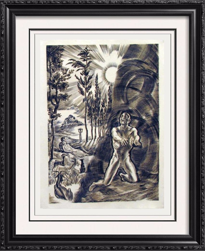 Albert Decaris | Title of Art: c. 1939 From the Samson Agonistes Suite | Medium: Engraving on Paper | Edition #: 5/55 | Unframed Size: 15 x 11 inches | Offered Unframed | Value: $ 950 | Art For Sale presents limited edition engravings by Albert Decaris from Samson Agonistes by poet John Milton. Drawing on the story of Samson from the Old Testament, Judges 13–16, each engraving is a dramatization of the story starting at Judges 16:23. The drama starts as Samson has been captured by the Philistines, had his hair, the container of his strength, cut off and his eyes cut out. Samson is "Blind among enemies, O worse than chains" (line 66).Samson undergoes despair when he loses God’s favor in the form of his strength. Milton’s dramatic poem, however, begins the story of Samson after his downfall—after he has yielded his God-entrusted secret to Dalila (Delilah), suffered blindness, and become a captive of the Philistines. Tormented by anguish over his captivity, Samson is depressed by the realization that he, the prospective liberator of the Israelites, is now a prisoner, blind and powerless in the hands of his enemies. The focus of Milton’s dramatic poem is ultimately on Samson’s regenerative process, an inner struggle beset by torment, by the anxiety that God has rejected him, and by his failure as the would-be liberator of his people. Samson’s discourse manifests an upward trajectory, through atonement and toward regeneration, which culminates in the climactic action at the temple of Dagon where Samson, again chosen by God, vindicates himself. In his searching for a way to return to being true to God and to serve his will, Samson is restored and again is in God’s grace and able to serve God. | Albert Decaris (1901-1988): One of France’s foremost engravers of the twentieth century, Albert Decaris is born in Normandy in Sotteville-les-Rouen in 1901. He began his formal art studies at the age of fourteen at the Ecole Estienne. Four years later he was accepted into the Ecole des Beaux-Arts (School of Fine Arts), Paris, and studied in the studios of Carmon and Laguillermie. Within six months Decaris had won the Premier Grand Prix de Rome of engraving (1919) and became the youngest student ever to win this prestigious honor for his work ‘Eve before the sin’. Decaris thus journeyed to Rome where he worked and lived at the Villa Medici. Unfortunately he contacted malaria on a journey to Paestum and was critically ill for a period of one year. Upon his recovery Albert Decaris was ‘rewarded’ with a two year mandatory service in the French military. After this he concluded his fellowship in Rome and then returned to Paris. He first worked upon a series of engravings of Belgian subjects which he submitted to the Paris Salon. These works received the Salon’s Medaille d’Argent (Silver Medal). It was the first time in the Salon’s long history that an artist had received this major medal with his premiere presentation. During the following years Albert Decaris created a major oeuvre of original engravings and etchings, both as individual plates and as illustrations for livres d’artistes. In the first category, he began with big engravings inspired by his classic souvenirs, mythological scenes like Leda and the Swan, The Rape of Europe, Pasiphae, etc. In the latter category he illustrated such magnificent books as Shakespeare’s, Macbeth (1930), Cathlin’s, Le Sommeil d’Endymion (1934), Milton’s, Samson Agonistes (1939), Chenier’s, Eglogues (1945), Henriot’s, Mythologie des Anciens Grecs et Romains (1955), Corneille’s Theater (1955-1961), Emile Henriot, Les Trophees (1967) and Eschyle, Tragedies, under the direction of Mario Vincent (1975-1977). One of Decaris’s greatest illustrated books is Pierre de Ronsard’s, Discours des Miseres de ce Temps, which was published in Paris in 1930. Consisting of three large volumes, Decaris created forty-five engravings which were published in an edition of 359. As well, Decaris selected some of the plates to be printed separately in a limited edition of one hundred signed impressions. Such is the case with Ronsard, which probably served as the frontis-piece to the above named volume. He illustrated around 200 books, especially Ronsard, Shakespeare, La Rochefoucauld, Chateaubriand, Vigny, Montherlant, Claudel, Giono... He collaborated to the Art-Deco International Exhibition of 1937 in Paris where he realized 300 square meters of paintings and to the International Exhibition of New York in 1938 for which he did a huge painting ‘The Plague’. He did huge frescoes for the monumental stairs of the City Hall of Vesoul and for other monuments, churches and chapels. Between 1935 and 1985 Albert Decaris created more than six hundred stamps for France (174) and its territories, Monaco, Andorra, Tunisia, etc. Held in equally high esteem for his architectural, historical, landscape, portrait and figurative engravings, he became a full member of the Academie des Beaux-arts in 1943 and was nominated its President in 1960 an re-elected four times. In 1962 Decaris was named the official painter of the Marine Francaise (Navy). His style, ample, classic and marked with archaism of his engraving work can be also find in the severe disposition of his drawings and paintings.