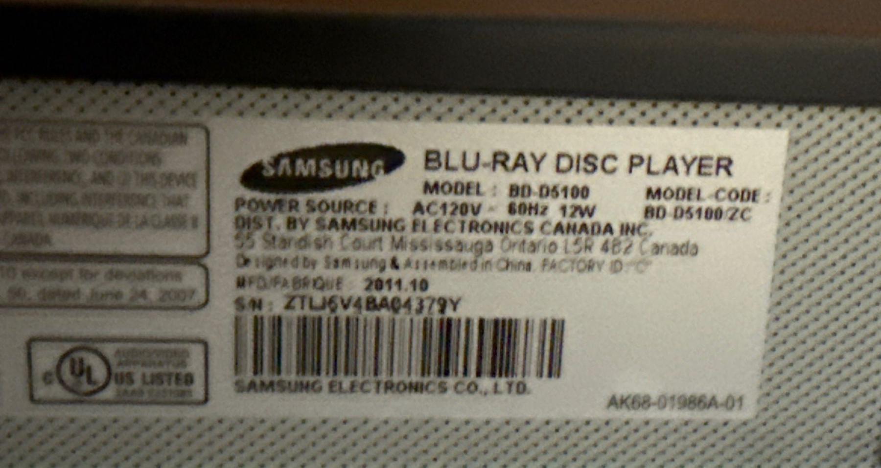 Samsung Blu Ray Disc Player Model BD-D51002C