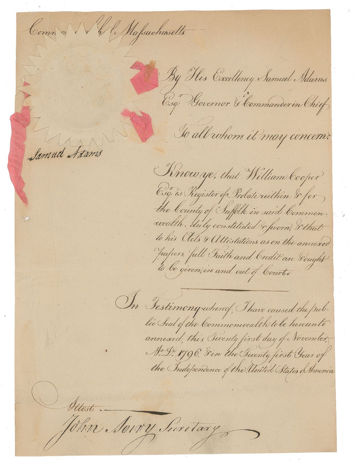 Manuscript DS, one page, 7.75 x 10.75, November 21, 1796. As governor of Massachusetts, Adams affirms "that William Cooper Esqr. is Register of Probate within & for the County of Suffolk in said Commonwealth, duly constituted & sworn, & that to his Acts & Attestations as one the annexed papers, full Faith and Credit are & ought to be given, in and out of Court." Boldly signed in the upper left by Governor Adams, and countersigned by John Avery as secretary. The seal of the Commonwealth of Massachusetts and a pink ribbon are affixed to the upper left corner. In fine condition, with trimmed edges and a small hole to the left edge.