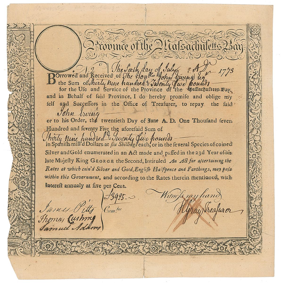 Signer of the Declaration of Independence from Massachusetts (1722–1803). Adams emerged as one of the early leaders of the movement against the Stamp Act and other British tax measures of the 1760s. Partly-printed DS, one page, 8 x 8.25, July 6, 1773. Rep