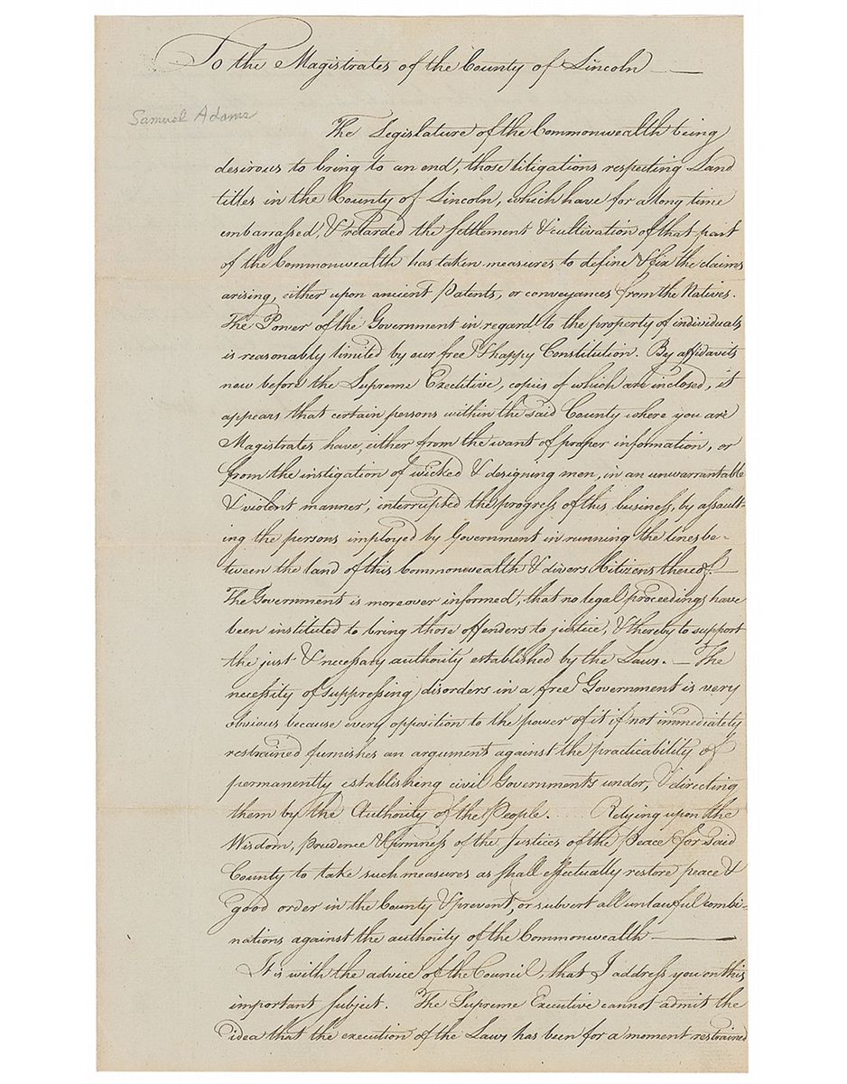 Manuscript DS, one page both sides, 7.75 x 12.5, February 29, 1796. As governor of Massachusetts, Adams orders the magistrates of Lincoln County to restore order and expedite the prosecution of men who had threatened a surveyor employed by the government. In part: “The Legislature of the Commonwealth being desirous to bring to an end, those litigations respecting Land titles in the County of Lincoln, which have for a long time embarrassed and retarded the settlement and cultivation of that part of the Commonwealth…The Power of the Government in regard to the property of individuals is reasonably limited by our free & happy Constitution. By affidavits now before the Supreme Executive, copies of which are enclosed, it appears that certain persons within the said County where you are Magistrates have, either from the want of proper information, or from the instigation of wicked & designing men, in an unwarrantable & violent manner, interrupted the progress of this business by assaulting the persons employed by the Government in running the lines between the land of this Commonwealth & divers Citizens thereof. The Government is moreover informed, that no legal proceedings have been instituted to bring those offenders to justice…The necessity of suppressing disorders in a free Government is very obvious because every opposition to the power of it if not immediately restrained furnishes an argument against the practicability of permanently establishing civil Governments under, & directing them by the Authority of the People…It is with the advice of the Council that I address you on this important subject. The Supreme Executive cannot admit the idea that the execution of the Laws has been for a moment restrained by fear; for should your candid and friendly explanation, and your firm determination to carry the laws into execution…prove insufficient to produce actual submission, such part of the force of the Commonwealth as shall be necessary must be exerted to suppress every opposition to the Government.” In fine condition, with a couple light vertical wrinkles through a portion of the signature. Accompanied by two testimonies written in another hand, both signed by secretary John Avery. All documents are housed in a red half-morocco clamshell box.