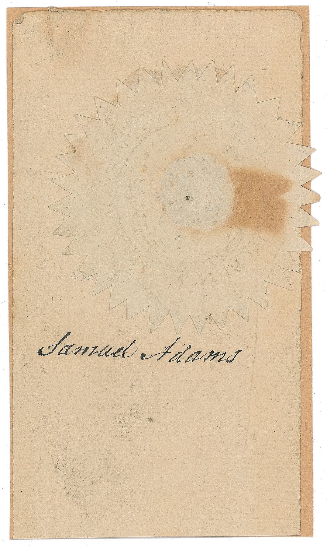 Signer of the Declaration of Independence from Massachusetts (1722–1803) who emerged as one of the early leaders of the movement against the Stamp Act and other British tax measures of the 1760s. Bold ink signature, "Samuel Adams,” on an off-white 3.25 x 5.75 slip clipped from an official document, retaining its white paper Commonwealth of Massachusetts seal. Affixed to a slightly larger sheet. In fine condition, with a square of toning to the seal.