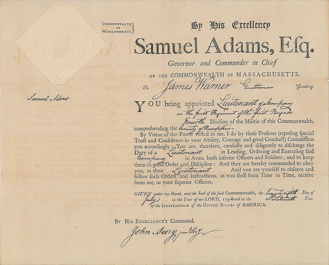 Partly-printed DS, one page, 15.75 x 12.75, July 28, 1794. As governor of Massachusetts, Samuel Adams appoints James Warner as "Lieutenant of a Company in the first Regiment of the first Brigade, Fourth Division of the Militia of this Commonwealth." Boldly signed in the upper left by Governor Adams, and countersigned at the conclusion by John Avery as secretary. The white paper seal affixed to the upper left remains fully intact. In fine condition, with intersecting folds. A beautiful, well-preserved document signed by a hero of the American Revolution.