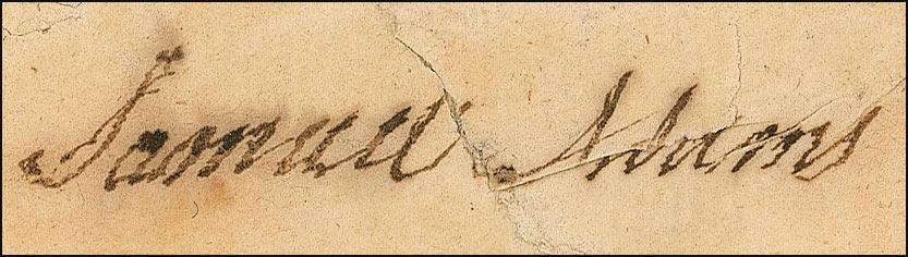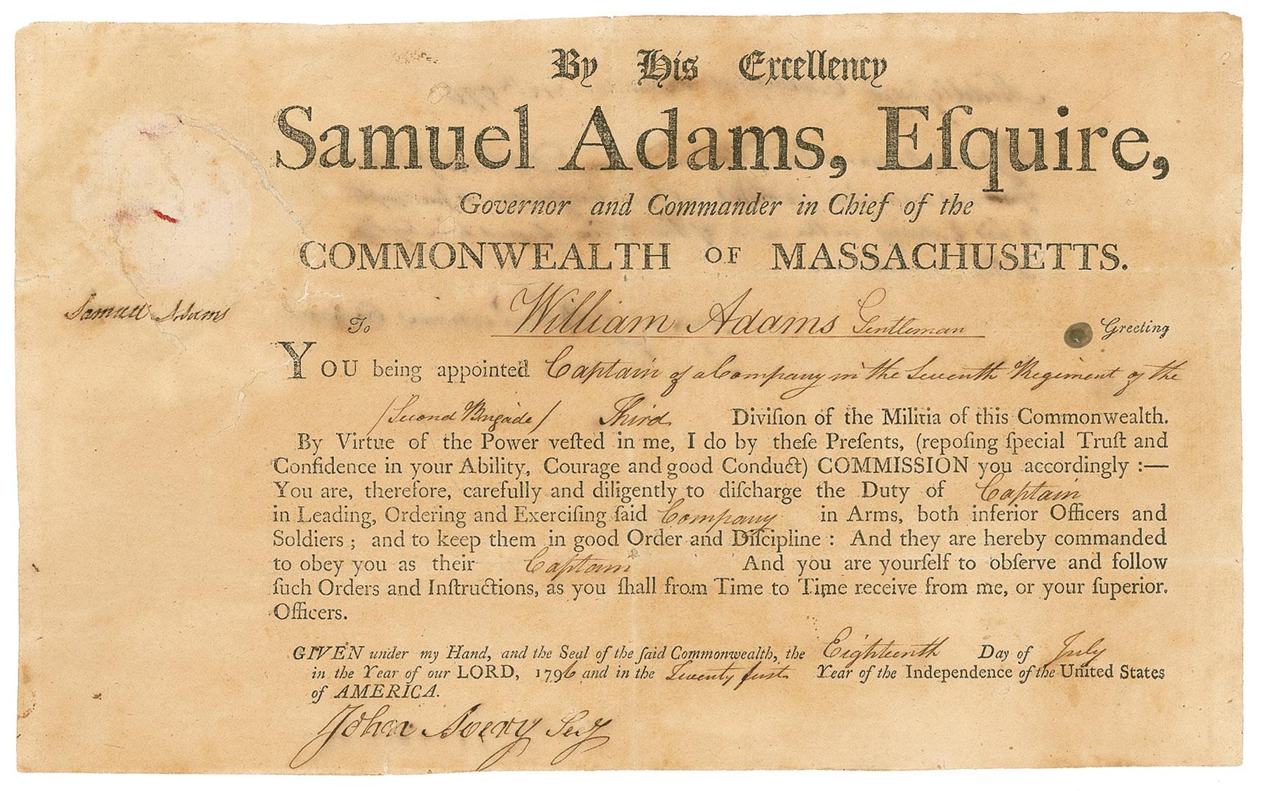 Partly-printed DS, one page, 14.5 x 9, July 18, 1796. Adams appoints William Adams, a “Captain of a Company in the Seventh Regiment of the Second Brigade, Third Division.” Signed in the upper left in black ink under the embossed seal. In good condition, with professionally repaired tears to the seal area (some of which affects the last name), professional repairs to a few separations, mostly uniform toning, lightly trimmed edges, light show-through from docketing on reverse, and light staining.