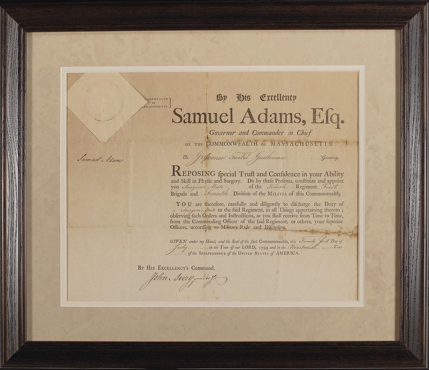 Uncommon medical-related partly-printed DS, one page, 14.75 x 11.5, July 21, 1794. Governor Adams “reposing Special Trust and Confidence in your ability and skill in Physic and Surgery,” appoints Grosvenor Tarbel a “Surgeon’s Mate of the Fourth Regiment, First Brigade and Seventh Division of the Militia of the Commonwealth.” Signed on the left side in black ink by Adams, and countersigned by Secretary of the Commonwealth John Avery, Jr. Double suede matted and framed to an overall size of 22 x 18.5. In very good condition, with partial separations, toning, and paper loss along intersecting folds, and scattered light toning heavier near top. The white paper seal is worn but intact. An uncommon appointment signed during a tense time in the country.