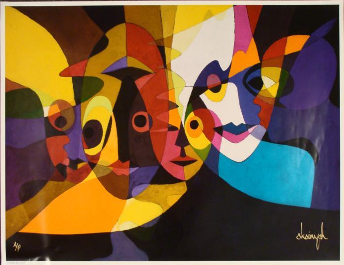 This art poster portrays African masks in contemporary Cubist style, with bright colors. Artist: Samuel AkainyahSignature: In gold paint pen, lower right Edition: Artist Proof, marked AP, lower leftMedium: Print on poster paperImage size: 31 x 40 inches Publisher: Akainyah Gallery, ChicagoCondition: very good; normal light wrinkles, surface scuffsThis poster blends traditional imagery with vivid modern forms.Samuel Akainyah immigrated to the United States from Ghana, West Africa, to study art at the school of the Art Institute in Chicago. His art first became widely recognized when paintings of his were noticed on the set of the NBC movie, The Father Clements Story . Akainyah was soon selected as official artist for the 1996 Democratic National Convention, held in Chicago. He is now a tenured professor of art at one of the City Colleges of Chicago, and maintains his own gallery in the River North neighborhood. His art is collected avidly by many, including Bryant Gumbel, Michael Jordan, Samuel L. Jackson, Marion Brooks, and many others.