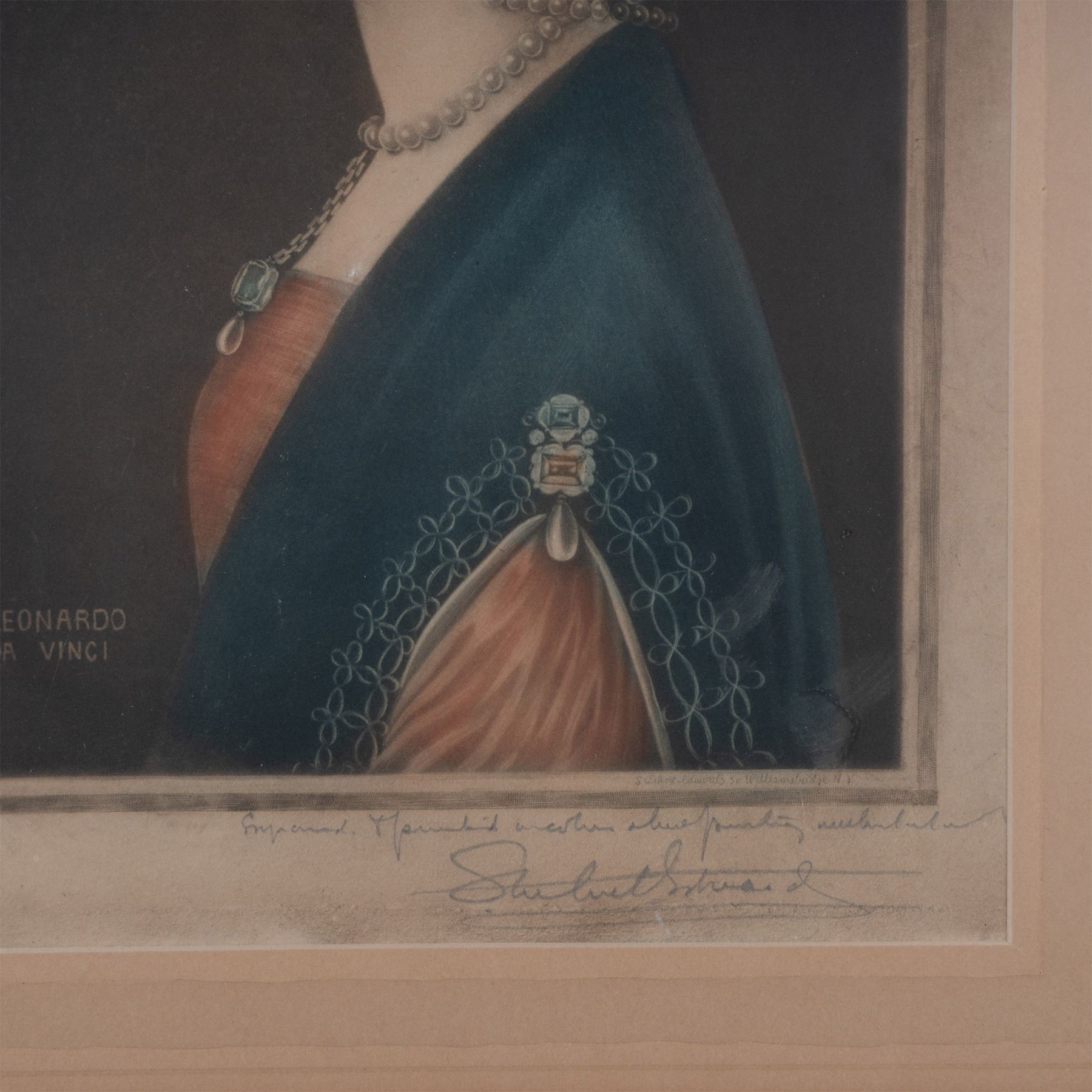 An exquisite color intaglio on paper after Leonardo Da Vinci's original portrait of Italian noblewoman Beatrice d'Este. Signature on lower right of plate and in graphite on lower right of paper. Housed in a gilded frame with a beige mat. Sight size: 8"L x 12.25"H. Frame dimensions: 15"L x 0.75"W x 20"H.