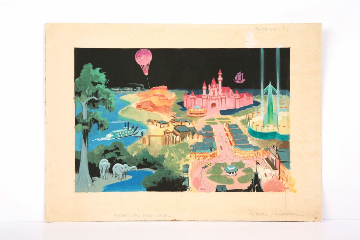 (Disneyland, 1955) Beautiful painting by the Legendary background artist Samuel Armstrong for a Disneyland golden book. Accomplished in gouache on 10.5"x14.75" artists' board. Image size is 7.75"x11.5". Signed by Armstrong at the lower right. Fine condition with minimal edge wear.