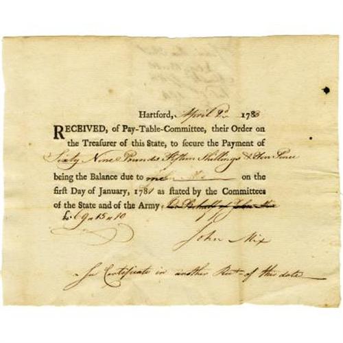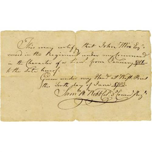 <B>Revolutionary War General Samuel B. Webb Document Signed</B></I> “<I>Saml B. Webb Col,</B></I>” one page, 8” x 5”. West Point, June 10, 1783. In full, “<I>This may certify that John Mix Esqr. served in the Regiment under my command in the Character of a Lieut. From January 1781 to the date hereof.</B></I>” The name “<I>John Mix Esqr.</B></I>” is in Webb's hand. He signed as Colonel, 3rd Connecticut Regiment. Partial separation at top half of mid-vertical fold. Accompanied by a partly printed DS “<I>John Mix,</B></I>” one page, 8” x 6.25”. Hartford, April 2, 1783. Receipt of “<I>Sixty Nine Pounds Fifteen Shillings & Ten Pence being the Balance due to me…</B></I>” signed by Lt. Mix. Both documents are in fine condition. <BR><BR><b>Shipping:</b> Flat Material, Small (<a target="_blank" href="http://www.heritageauctions.com/common/shipping.php">view shipping information</a>)