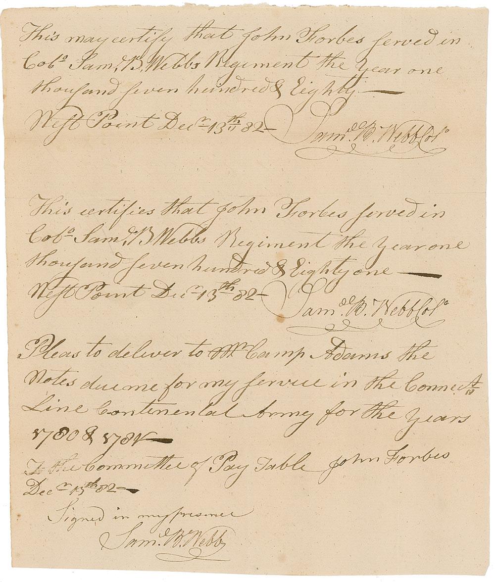 Revolutionary War general wounded at Bunker Hill and Trenton. Manuscript DS, signed three times, twice “Sam B. Webb Col,” and once “Sam. B. Webb,” one page, 7.5 x 9, December 13, 1782. Webb certifies that John Forbes served in Webb’s regiment during the years 1780 and 1781. Intersecting folds, a couple passing through two of the signatures, and scattered toning, otherwise fine condition.