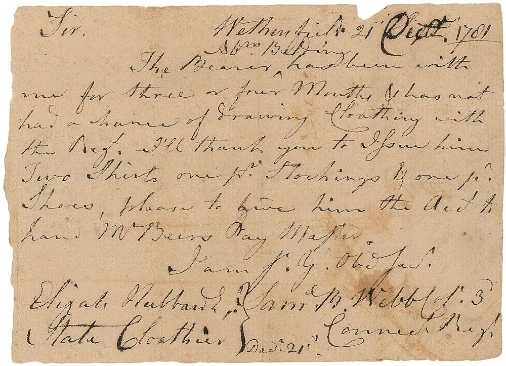 Revolutionary War general wounded at Bunker Hill and Trenton. War-dated LS signed “Sam. B. Webb,” one page, 5.5 x 4, December 21, 1781. Letter to the State Clothier. In part: “The Bearer has been with me for three or four Months & has not had a manner of drawing Clothing with the Regt. I’ll thank you to issue him Two shirts, one pr. Stockings & one pr. Shoes.” In very good condition, with intersecting folds, a couple passing through signature, scattered toning and soiling, and a few edge chips.