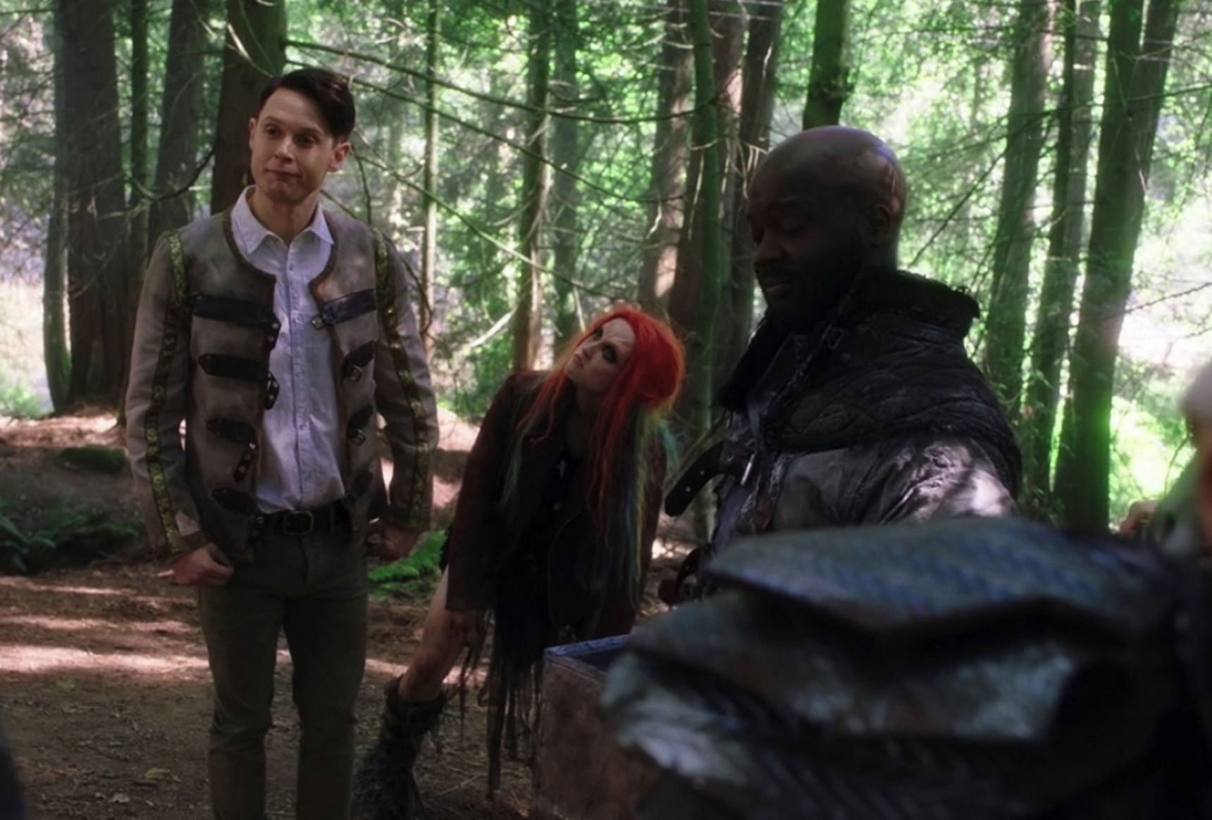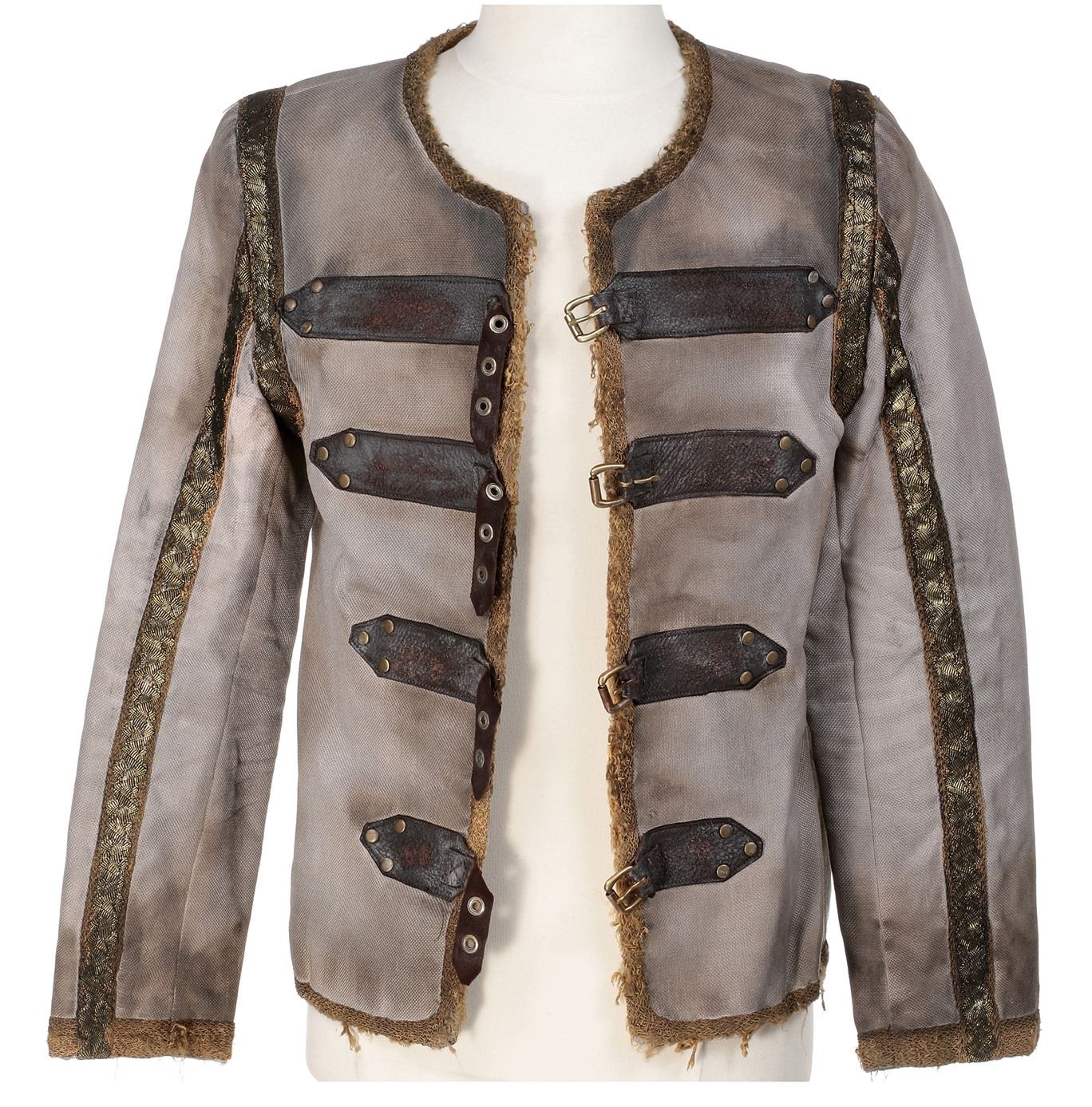 83. Samuel Barnett "Dirk Gently" Wendimoor toggle jacket from Dirk Gently's Holistic Detective Agency. (BBC America, 2016-2017) Custom Medieval fantasy jacket with gold braid trim and faux leather strap and metal buckle front closure. Exhibiting studio distress including soiling and light fraying over all. Worn by Dirk throughout his time in Wendimoor. In very good condition. Starting Bid: $25