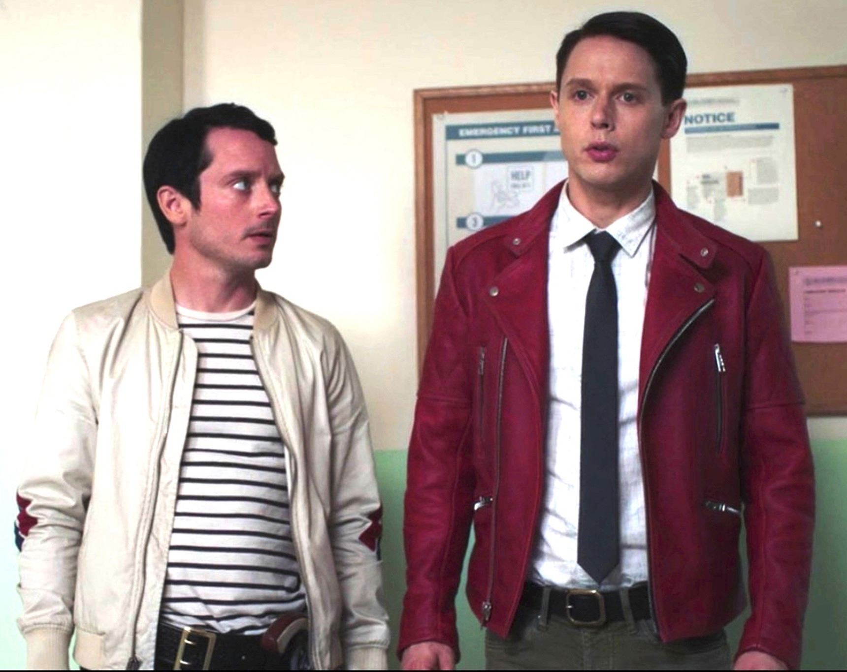 Samuel Barnett 'Dirk Gently' red leather jacket and black tie from Dirk Gently's...